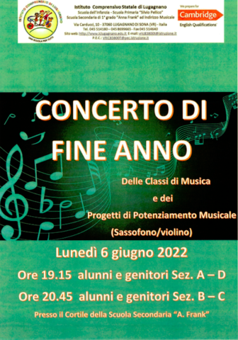 Il 6 giugno 2022, la Scuola Secondaria di I grado ‘A. Frank’ di Lugagnano propone alle famiglie degli alunni un concerto di fine anno tenuto da tutti gli alunni della Scuola Secondaria. Dopo due anni di assenza della musica dal vivo all’interno della scuola, si prova a ripartire. Per alcuni alunni questo momento rappresenterà l’unica occasione per potersi esibire dal vivo con un pubblico ‘vero’ e non ‘virtuale’. Il valore pedagogico-didattico-educativo dell’esperienza musicale dal vivo, contribuisce a mettere in atto un processo di apprendimento che coniuga intelletto ed emozione, ragione e sentimento, individualità e coralità; un momento in cui ogni singolo alunno si sente parte del gruppo classe portando con sé la propria competenza che però assume senso solo se in relazione perfetta con quelle di tutti gli altri alunni. Il concerto sarà suddiviso in due momenti in modo tale da permettere la visione a tutti i genitori. Alle ore 19.15 saranno invitati i genitori delle Sez. A e D, mentre alle ore 20.45 saranno invitati i genitori delle Sez. B e C. Inoltre all’interno del secondo intervento si esibiranno anche gli alunni che partecipano a progetti di potenziamento musicale: sassofono e violino. Il concerto è organizzato in collaborazione con il Comitato Genitori di Lugagnano.