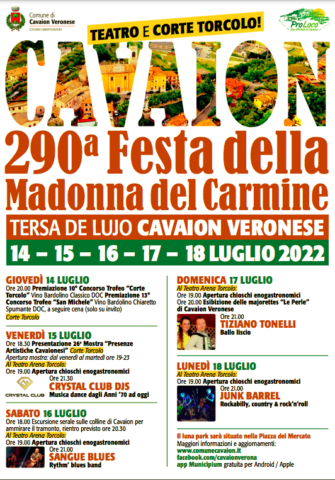 Nel cuore di Cavaion torna la storica festa del paese, giunta alla 290ª edizione e riappropriarsi del proprio spazio e programma dopo uno stop di due anni. A fare da traino il doppio concorso enologico legato al Bardolino Classico DOC e al Bardolino Chiaretto Spumante DOC. Si riparte dalla location del 2019, Corte e Teatro Torcolo, con la sinergia tra Pro Loco, Comune e associazioni cavaionesi a garantire lo svolgimento della manifestazione che, tra offerte artistiche e musicali, punterà forte sulle proposte enogastronomiche. La festa inizierà proprio stasera, alle ore 20 ci sarà la Premiazione del 10° Concorso Trofeo ‘Corte Torcolo’ Vino Bardolino Classico DOC e del 13° Concorso Trofeo ‘San Michele’ Vino Bardolino Chiaretto Spumante DOC, a seguire cena presso Corte Torcolo. Il programma è ricco e andrà avanti fino a lunedì 18 luglio. Tutti i dettagli e il programma sono disponibili sul sito del Comune.