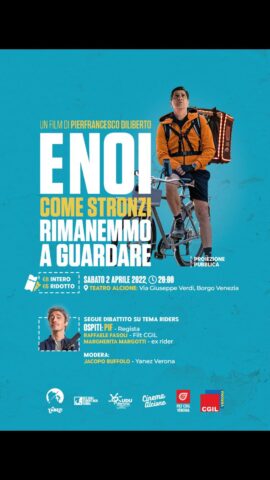 Sabato 2 aprile alle ore 20.00 verrà presentato al Teatro Alcione il nuovo film di Più dal titolo ‘E noi come stronzi rimanemmo a guardare’. La serata, organizzata dall’associazione Yanez Verona, si concluderà con un dibattito che vede coinvolto il regista, la FILT CGIL Verona e soprattutto le testimonianze dirette di giovani riders, che ancora lottano per quelle tutele fondamentali troppo spesso mancanti, continuando a vivere nel precariato e nello sfruttamento legalizzato. “Noi non vogliamo restare a guardare – commenta Jacopo Buffolo, tra i fondatori di Yanez -. Molti giovani, soprattutto studenti, si trovano costretti a lavorare sottopagati e senza tutele, per mantenersi e continuare gli studi. Durante la pandemia il servizio a domicilio è stato sicuramente utile per molte situazioni problematiche, ma non si è tenuto conto della condizione dei lavoratori”. L’obiettivo è quindi quello di contrastare la precarietà di questo settore, affinché anche il lavoro dei Rider venga considerato come tale al 100%. Un tema delicato al quale non viene riservato molta attenzione. Lo stesso Più in un’intervista sottolineava il fatto che in una società sana e moderna, non dovrebbe essere necessario un intervento simile per arrivare ad ottenere diritti basilari sul lavoro. Ecco perché Yanez Verona ha deciso di fare di tutto per promuovere il film. Sì, perché la sua proiezione vuole essere un momento di confronto, ma soprattutto di spinta ad agire. I biglietti sono acquistabili online sulla pagina https://www.facebook.com/events/694608828340585?ref=newsfeed.