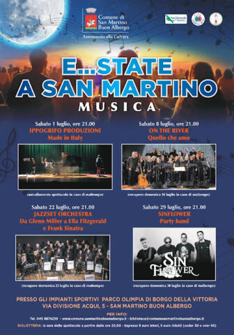 A San Martino Buon Albergo l’estate si accende a tempo di musica con la rassegna ‘E…state a San Martino’ promossa dall’Amministrazione comunale che si svolgerà nel mese di luglio presso il Centro Sportivo Olimpia di Borgo della Vittoria. “Con gli eventi estivi – spiega il sindaco Giulio Furlani – i cittadini avranno l’occasione di godere di una piacevole serata di musica sotto le stelle. Inoltre con ‘E..state a San Martino’ abbiamo la possibilità di valorizzare il Centro Sportivo, oltre l’aspetto sportivo, come luogo di cultura e spazio di socialità”. Si parte sabato 1 luglio con lo spettacolo musicale Made in Italy di Ippogrifo Produzioni. Un viaggio nella musica italiana con l’interpretazione intensa di Andrea Manganotto, la voce ruggente di Jessica Grossule, le parole di Alberto Rizzi e la voce di Chiara Mascalzoni. Per tutto il programma e maggiori info: 045 8874239 -www.comune.sanmartinobuonalbergo.it –biblioteca@comunesanmartinobuonalbergo.it. BIGLIETTERIA: la sera dello spettacolo a partire dalle ore 20.00 – ingresso 8 euro interi, 5 euro ridotti (under 30 e over 65).