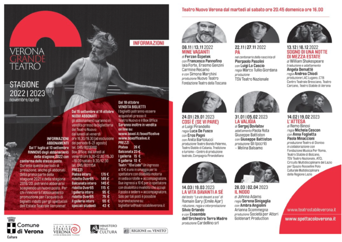 Fino al 14 ottobre continua la vendita degli abbonamenti al Grande Teatro, che torna nella sua 36^ edizione alla normalità, con la proposta di otto spettacoli in cartellone. Il prezzo degli abbonamenti rimane invariato rispetto alle stagioni precedenti. La vendita avviene fisicamente alla biglietteria del Teatro Nuovo. Ad inaugurare la rassegna, dall’ 8 al 13 novembre, MINE VAGANTI, spettacolo di Ferzan Özpetek che firma la sua prima regia teatrale portando in scena l’adattamento di uno dei suoi capolavori cinematografici, Mine vaganti del 2010. Dal 22 al 27 novembre, il programma prosegue con PA’, omaggio a Pier Paolo Pasolini nel centenario della nascita. La regia è di Marco Tullio Giordana, che firma anche la drammaturgia a quattro mani con Luigi Lo Cascio, protagonista dello spettacolo. Un programma ricco di spettacoli, e tutte le date sono consultabili sul sito del Comune di Verona.