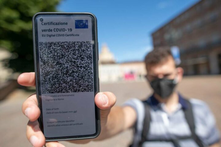 TURIN, ITALY - JUNE 30: A man shows Italy's Covid-19 Green Pass for post-vaccine travel on a smartphone on June 30, 2021 in Turin, Italy. The digital health certificate, or Green Pass, was officially launched by Italian Prime Minister Draghi, allowing people to access certain events and facilities in Italy as well as travel domestically and abroad. (Photo by Stefano Guidi/Getty Images)