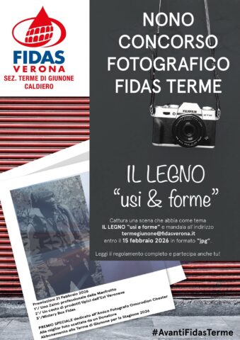 C’è tempo fino al 15 febbraio per partecipare al nono concorso fotografico promosso dai donatori di sangue della sezione Fidas Verona Terme di Giunone-Caldiero. Partecipare non costa nulla: basta inviare il proprio scatto inedito sul tema di questa edizione ‘Il legno: usi e forme’ all’indirizzo mail termegiunone@fidasverona.it. Il formato della foto dev’essere jpg: oltre all’immagine occorre indicare anche i propri dati anagrafici, allegando la carta d’identità, un recapito telefonico e una breve descrizione della foto. Il concorso è aperto a tutti i fotografi non professionisti residenti in Veneto. I donatori di Fidas Verona ricordano che per prenotare la donazione basta chiamare il numero verde gratuito 800.310.611 (da fisso), lo 0442.622867 (da cellulare), il 339.3607451 (telefonate/sms) o inviare una mail a prenota.trasfusionale@aulss9.veneto.it. Dal mese scorso, inoltre, è possibile prenotarla anche sul sito www.fidasverona.it, compilando un apposito form.