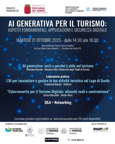 Tema dell’incontro: ‘AI Generativa per il Turismo: aspetti fondamentali, applicazioni e sicurezza digitale’.A Peschiera andrà in scena una grande simulazione: operatori turistici, albergatori, ristoratori e guide lavoreranno insieme, laptop alla mano, per creare contenuti, rispondere a recensioni e progettare itinerari personalizzati con l’aiuto dell’intelligenza artificiale. L’incontro si terrà martedì 21 ottobre, dalle 14.30 alle 18.00, nella Sala Conferenze del Centro Civico F. Gandinidi Peschiera del Garda. La partecipazione è gratuita, con iscrizione su www.benacushub.com.