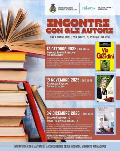 Prosegue l’impegno del Comune di Pescantina nella promozione della cultura e della lettura con una nuova edizione di ‘Incontri con gli autori’, la rassegna organizzata dall’Assessorato alla Cultura in collaborazione con la Biblioteca Comunale ‘Charta’.Tre appuntamenti aperti al pubblico, pensati per favorire il confronto con scrittori contemporanei e per valorizzare il piacere della parola scritta come occasione di incontro e condivisione. Gli incontri si terranno nella Sala Consiliare di via Ponte 7, con inizio alle ore 20.45, e saranno seguiti da un momento di firma copie. Il primo appuntamento è previsto per giovedì 17 ottobre; il secondo incontro, in programma giovedì 13 novembre mentre l’ultimo appuntamento, giovedì 4 dicembre sarà dedicato a un tema di grande attualità e sensibilità sociale come quello della disabilità, promuovendo autodeterminazione, inclusione e pari opportunità.