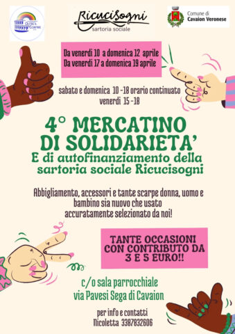 Non si ferma mai l’attività di ‘Ricucisogni’, sartoria sociale professionale che dona opportunità e lavoro a chi opportunità e lavoro non ha. ‘Ricucisogni’, che ha sede a Sega di Cavaion, fornisce una formazione professionalizzante e avvia al lavoro gli ospiti dell’associazione e le persone che sul territorio hanno bisogno di un supporto morale ed economico concreto. Per raggiungere questo ambizioso obiettivo la sartoria sociale ha costantemente bisogno di impiegare risorse, umane ed economiche: è possibile sostenere il progetto con il proprio tempo o con una donazione economica una tantum o continuativa oppure attraverso il 5 per mille. Oppure acquistando on line o attraverso un evento di promozione…è questo il caso della quarta edizione del Mercatino di solidarietà organizzato da Ricucisogni da venerdì 10 a domenica 12 aprile e da venerdì 17 a domenica 19 aprile presso la sala parrocchiale di Sega di Cavaion in via Pavesi. Abbigliamento, accessori e tante scarpe donna, uomo e bambino sia nuovo che usato accuratamente selezionato dalla sartoria sociale saranno a disposizione con un contributo da 3 e 5 euro. Il mercatino è aperto il venerdì dalle 15.00 alle 18.00, il sabato e la domenica dalle 10.00 alle 18.00 con orario continuato.