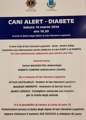 ‘Cani Alert’ e diabete. L’interessante argomento sarà trattato alla baita degli Alpini di San Giovanni Lupatoto sabato 16 marzo alle ore 19.30. La serata è organizzata dal Lions Club San Giovanni Lupatoto – Zevio Destra Adige presieduto da Vittorio Borselli con la collaborazione del Comune di San Giovanni Lupatoto. La malattia del diabete sarà trattata dal relatore dott. Maurizio Poli, diabetologo, che parlerà di questa malattia a volte subdola. Inoltre il cinofilo Roberto Zampieri presenterà il ‘Progetto Serena’ che, anche grazie alla sua passione e impegno, ha stilato il ‘Protocollo Cani allerta nel diabete’, un metodo che rimane ad uso esclusivo del Progetto Serena Onlus APS. Interverranno alla serata per il Comune di San Giovanni Lupatoto, il sindaco Attilio Gastaldello, Maurizio Simonato, assessore ai Servizi Sociali e Sicurezza, e Bianca Grigoli, consigliere Comunale con l’incarico per la Tutela degli animali. L’obiettivo è quello di riuscire a far conoscere a tutte quelle persone che convivono con questa malattia cronica, un cane ‘Alert’ e di come, grazie a personale abilitato all’insegnamento, anche il cane amico di casa, possa diventare di grande aiuto a riconoscere i vari mutamenti e picchi di glicemia delle persone interessate. “I Cani Alert – evidenzia il presidente del Club Lions, Vittorio Borselli – è un progetto fantastico che si prefigge di far avere a tutti coloro che convivono con questa malattia cronica un cane allerta, senza che il paziente diabetico, o la sua famiglia, sia costretto a sostenere costi proibitivi. Ogni cane, senza distinzione di razza, può diventare un cane allerta diabete, se soddisfa alcune caratteristiche. Il cane con il suo fiuto ti salva la vita”. Alla serata porteranno la loro esperienza alcune famiglie che convivono con questa realtà. La partecipazione, aperta a tutta la cittadinanza, è gratuita. Chi fosse interessato avrà la possibilità di cenare al costo di euro 15.