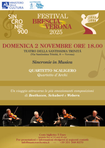 Il Festival SINCRONIE 900, alla sua prima edizione, nasce dall’impegno dell’Associazione Artematica e si svolge tra le città di Brescia e Verona. La direzione artistica è affidata a Paolo Baglieri, mentre il ruolo di assistente alla direzione artistica è ricoperto da Antonio D’Alessandro. Il Festival ha avuto il prestigio di essere inserito tra i progetti finanziabili dal Fondo Unico per lo Spettacolo del Ministero della Cultura per il triennio 2025–2027 e gode del patrocinio del Comune di Brescia, riconoscimenti che ne sottolineano il valore artistico e progettuale. Il cartellone di questa prima edizione prevede 17 appuntamenti, di cui 11 a Brescia – ospitati nella Chiesa di San Giovanni Evangelista, nel Teatro di San Giovanni e nella Chiesa dei Santi Faustino e Giovita – e 6 a Verona, nelle suggestive sedi della Chiesa della Santissima Trinità in Monte Oliveto e del Teatro della Santissima Trinità. Il Festival vuole diventare un punto di riferimento per la musica d’arte del nostro tempo, unendo grandi interpreti della scena internazionale e giovani talenti emergenti. La programmazione si apre al repertorio del Novecento e contemporaneo, senza dimenticare la musica classica, la tradizione lirica e contaminazioni con jazz, tango e colonne sonore. L’obiettivo è proporre un dialogo multidisciplinare che includa anche teatro, danza e letteratura, offrendo al pubblico un’esperienza culturale ricca e stimolante. Prosegue a Verona, domenica 2 novembre alle ore 18.00 al Teatro della Santissima Trinità, il percorso musicale del Festival SINCRONIE 900 con ‘Sincronie in Musica’, un concerto da camera che vedrà protagonista il ‘Quartetto d’archi Scaligero’ -Verona. Formatosi nel 2006 su iniziativa del primo violino dell’Arena di Verona, il ‘Quartetto d’archi Scaligero’ ha saputo affermarsi per il suo repertorio versatile che spazia dal barocco al Novecento, con un gruppo composto da: Peter Szanto, Violino I – Bruno Donà, Violino II – Massimiliano Di Stefano, Viola – Zoltan Szabo, Violoncello. In questa occasione, la formazione affronterà pagine che dialogano con l’identità del Festival: musica del Novecento, classica e contemporanea, in un programma scelto con attenzione per valorizzare le potenzialità espressive del quartetto in uno spazio acustico intimo come il Teatro della Santissima Trinità. Ingresso 5 euro, gratuito sotto i 10 anni.