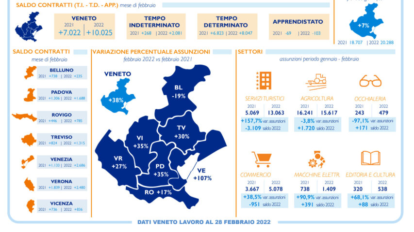 Il tema dell’occupazione è al giorno d’oggi molto delicato e anche per questo mese la Bussola di Veneto Lavoro ha redatto un’analisi del mese di febbraio, analizzando il mercato del lavoro. È stato appurato che in quest’ultimo mese il saldo tra assunzioni e cessazioni dei rapporti di lavoro a tempo indeterminato, a tempo determinato e di apprendistato è pari a +10.025 unità, un numero che supera sia l’analisi di febbraio 2020, che si febbraio 2021. La crescita dei posti di lavoro è attribuibile secondo quanto riportato al tempo determinato, ma anche il tempo indeterminato comincia a correre veloce, al contrario invece l’apprendistato per questo mese segna cifre negative. Risulta in crescita anche la domanda di lavoro, soprattutto nel settore industriale, che registra rispetto al 2021 +41%, invece troviamo nella situazione opposta il settore agricolo, che registra un andamento negativo con -8% rispetto al 2021. Nonostante si parli di un buon andamento generale, è importante sottolineare che anche il numero delle dimissioni cresce velocemente che nei primi mesi del 2022 è aumentato del 33% messo in comparazione sempre con il 2021. Purtroppo in questi mesi a seguire sarà sempre più difficile eseguire una stima con certezze più o meno stabili, considerando la situazione che stiamo vivendo al giorno d’oggi interessata da guerra Russia Ucraina e rincari.