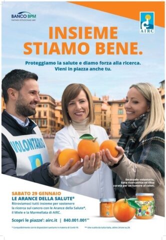 Anche nelle piazze di Verona e provincia, alla vigilia della Giornata Mondiale della Lotta al cancro, Fondazione AIRC torna con ‘Le Arance della Salute’ e insieme conferma un impegno di 136 milioni 645 mila euro per il 2022 a sostegno di oltre 5.000 ricercatori determinati a trovare le migliori soluzioni per la prevenzione del cancro. Un appuntamento che nasce sotto il segno del ritorno allo stare bene insieme, come sottolinea l’immagine scelta per la prima campagna dell’anno che ritrae insieme una ricercatrice, Sara Lovisa impegnata in un progetto sul tumore al colon; Elisa che è tornata a sorridere grazie alla ricerca, ed Emanuele, volontario nel ricordo di un amico scomparso per un linfoma. A loro si uniscono i circa duemila volontari di AIRC Veneto-Trentino Alto Adige, che dopo un anno di inevitabile assenza, sabato 29 e domenica 30 gennaio, ripopolano le piazze con gioia per testimoniare la loro fiducia nella ricerca e sensibilizzare i cittadini sull’importanza della prevenzione attraverso la sana alimentazione e abitudini di vita salutari.