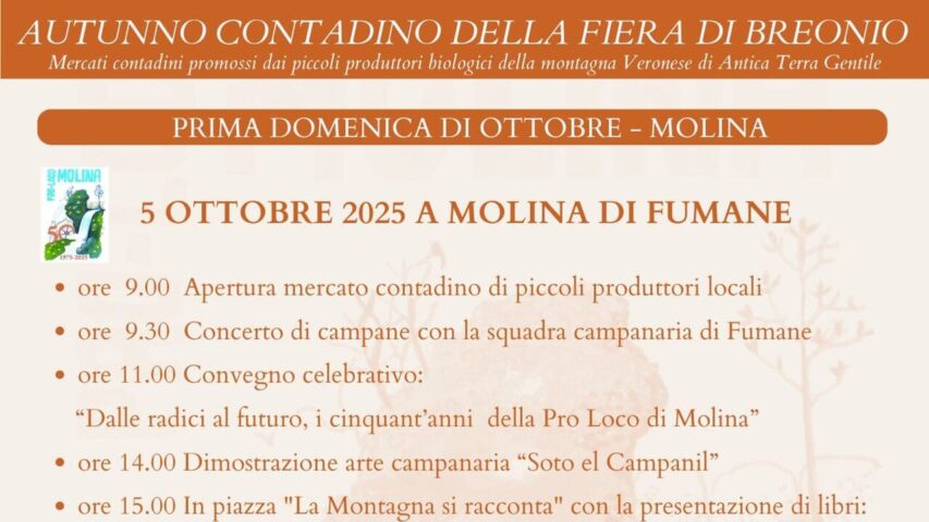 Sarà un ‘Autunno Contadino’ molto particolare quello del 2025 a Molina. Il 5 ottobre, in occasione dell’annuale evento, sarà festeggiato il 50° anniversario della Pro loco di Molina. Il mattino, alle ore 9.30, si aprirà il mercato. Seguirà un concerto di campane da parte della squadra campanaria di Fumane. Dopo il concerto si terrà un convegno per ringraziare tutte le persone che negli anni hanno contribuito a portare avanti e far crescere l’associazione. A pranzo saranno offerti gnocchi di malga a tutti gli invitati e a tutte le persone del paese. Nel pomeriggio saranno presentati alcuni libri ambientati in Lessinia a cura del presidente onorario della Pro Loco, Leonardo Ceradini. La Pro Loco di Molina nasce ufficialmente il 3 gennaio 1975 con l’obiettivo di promuovere lo sviluppo turistico del paese unitamente al suo meraviglioso Parco delle Cascate. Obiettivo pienamente raggiunto nel corso dei decenni. Negli anni i cambiamenti sono stati notevoli e la Pro loco, grazie ai Consigli di amministrazione che si sono succeduti, è stata traghettata egregiamente fino a noi. Oggi, a distanza di mezzo secolo, la Pro Loco, presieduta da Caterina Platano, collabora attivamente con Vivere Molina e con altre realtà associative, ed è un punto di riferimento per attività sociali che coinvolgono molte persone di Molina e non solo.