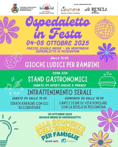 Il weekend del 4 e 5 ottobre prenderà vita la prima edizione di ‘Ospedaletto in Festa’, promossa dal comune di Pescantina con la collaborazione di Vivi Pescantina e di partner come AGSM AIM e Italgas. Sabato 4 ottobre il programma si aprirà con la giornata ‘Alla scoperta dell’Energia per famiglie’, dedicata ai piccoli studenti della scuola dell’infanzia e primaria e ai loro genitori. In mattinata è in calendario una gita al Parco Eolico di Rivoli Veronese, mentre nel pomeriggio le Scuole Medie di Ospedaletto diventeranno la sede di laboratori didattici, workshop sensoriali e letture animate. Saranno attivi anche stand informativi e spazi gastronomici. Dalle ore 15, i più piccoli potranno partecipare a giochi ludici organizzati negli spazi esterni e in serata il palco ospiterà il karaoke degli ‘Accordatura’ con possibilità di cenare presso gli stand gastronomici. Domenica 5 ottobre la festa proseguirà con nuove occasioni di divertimento. Nel pomeriggio torneranno i giochi e l’animazione per i bambini, mentre dalle 18 il pubblico potrà assistere a ‘Canti e scene di vita popolari’ proposti dal gruppo folcloristico La Resela de Pescantina. La partecipazione alle attività è gratuita. Per la gita al Parco Eolico e per i laboratori è consigliata l’iscrizione, da effettuare inviando una mail a gite@comune.pescantina.vr.it.