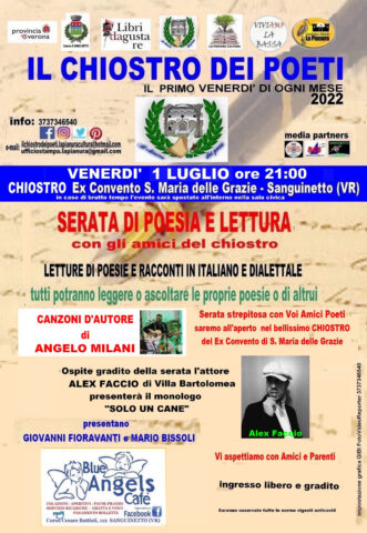 Nuova edizione 2022 del Chiostro dei Poeti, evento organizzato dalla Associazione Culturale ‘La Pianura’ nella sezione ‘Libri da Gustare’. Venerdì 1 Luglio alle ore 21 si svolgerà il primo appuntamento stagionale nel bellissimo Chiostro dell’Ex Convento di Santa Maria delle Grazie di Sanguinetto. Come ospiti speciali saranno presenti l’attore Alex Faccio di Villa Bartolomea, che presenterà il monologo ’Solo un cane’ e il cantante Angelo Milani che allieterà la serata con le sue canzoni d’autore. Il tutto sará condotto da Giovanni Fioravanti e Mario Bissoli.