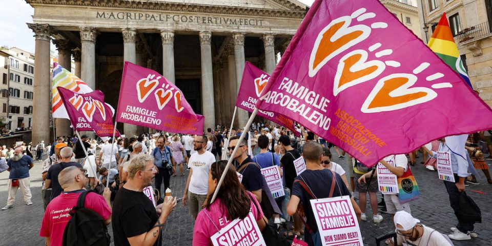 Sit-in di protesta organizzato da Famiglie arcobaleno e altre associazioni LGBTQIA+ per protestare contro la proposta di legge Varchi che vuole rendere la gestazione per altri (GPA) o maternit‡ surrogata reato universale, Pantheon, Roma 25 luglio 2023. ANSA/FABIO FRUSTACI