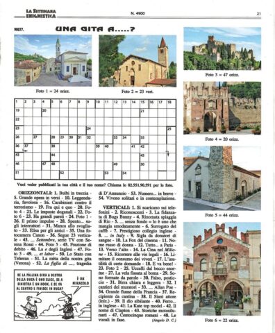 Si può visitare un borgo medievale rimanendo comodamente sul proprio divano e senza utilizzare internet? La risposta più semplice parrebbe essere no. Ma non è così, specie se il potenziale visitatore si sta cimentando con i rompicapo contenuti ne ‘La settimana enigmistica’, la rivista dedicata ai giochi più amata dagli italiani e che ogni settimana vende più di un milione di copie. E così, anche nel n. 4900, in uscita nei giorni scorsi, è tornata la rubrica ‘una gita a…’, che permette di scoprire il nome di una località italiana, della quale sono tuttavia allegate le foto dei suoi luoghi più iconici, solo dopo aver completato un insidioso cruciverba. Ebbene, i lettori che vorranno effettuare questa gita immaginaria, al termine del cruciverba vedranno comparire, come soluzione, una parola di cinque lettere: Soave. Scopriranno così, coloro che non lo sapessero già, che le sei foto che circondano il rompicapo, raffiguranti il santuario mariano della Bassanella, il castello scaligero, l’antico palazzo di giustizia, la chiesa di San Giorgio, la chiesa dei padri domenicani e porta Verona, appartengono proprio alla perla dell’est veronese, meta sempre più amata dai visitatori italiani e non solo.