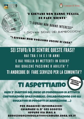 Dopo i riscontri positivi ottenuti dalle proposte estive rivolte ai giovani, il Servizio Educativo Territoriale e l’Assessorato alle Politiche Giovanili del comune di Sona rilanciano anche per la stagione invernale una serie di attività rivolte ai ragazzi e alle ragazze tra i 14 e i 18 anni che frequentano le scuole secondarie di secondo grado. L’intenzione è quella di promuovere la partecipazione dei giovani alla vita pubblica, sviluppando una cultura della cittadinanza attiva, che coniughi la proattività con la condivisione, per far sentire i giovani parte della comunità. Nello specifico, le attività coinvolgeranno i ragazzi nella sistemazione di luoghi pubblici e nella collaborazione con associazioni di volontariato del territorio ma, allo stesso tempo, in attività che saranno gli stessi partecipanti a proporre in base ai loro interessi o alle loro abilità. Ragazzi e ragazze saranno accompagnati da un educatore col ruolo di guida e coordinatore e da volontari del territorio a supporto del team. Le attività si svolgeranno ogni terzo martedì del mese in orario pomeridiano. L’impegno sarà ripagato con un gettone presenza come segno di ringraziamento e riconoscimento per essersi messi in gioco. Per informazioni e iscrizioni 045/6080155, oppure mandare una mail all’indirizzo serviziosocioeducativo@comune.sona.vr.it.