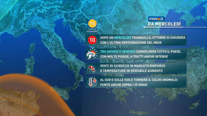 La tendenza meteo per l’ultima parte di ottobre indica un Halloween molto perturbato ma anche un weekend di Ognissanti probabilmente tranquillo. Dopo un fase caratterizzata da correnti nord-occidentali, da metà settimana sembra confermato un cambio della circolazione atmosferica sull’area euro-mediterranea. In queste condizioni le temperature si manterranno relativamente miti, ma sarà anche molto probabile il transito di alcuni sistemi nuvolosi. Dal 27-3 novembre, la settimana sarà caratterizzata dalla presenza di un promontorio subtropicale sul Mediterraneo centrale, con condizioni più stabili e asciutte soprattutto al Centro-Sud. Al Nord, in particolare sul Nord-Ovest e lungo la fascia alpina, sono attese precipitazioni sopra la media. Temperature in aumento su valori superiori alla norma climatologica.